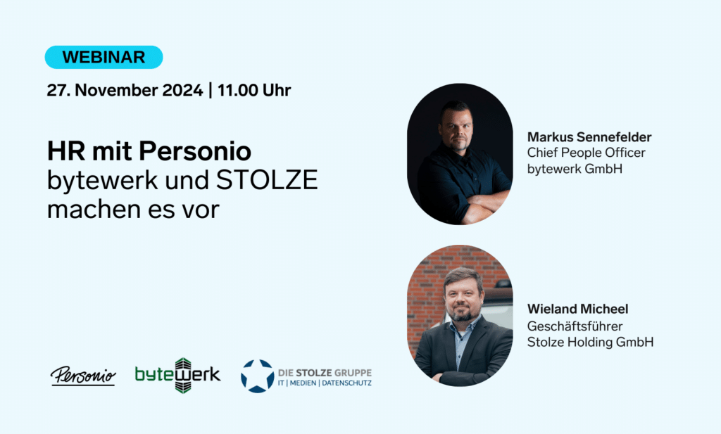 - Wissen, Erfahrungen und Antworten auf Fragen gibt es im Personio Webinar am 27. November 2024 um 11:00 Uhr „Bytewerk und STOLZE zeigen, wie’s geht!“